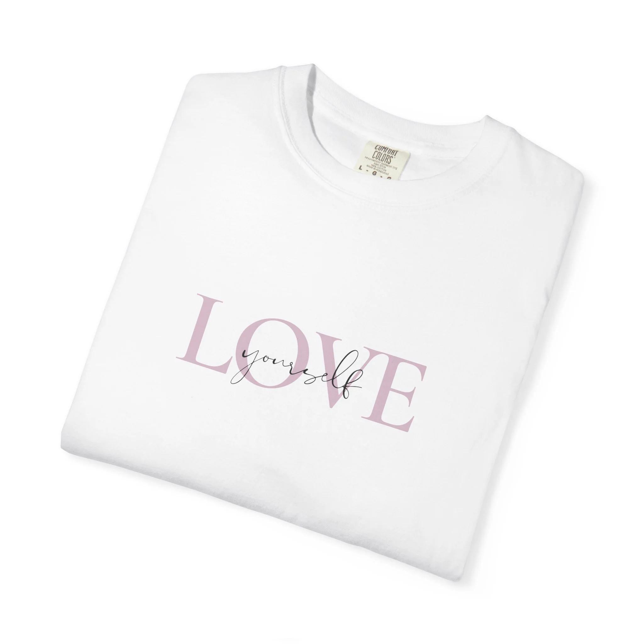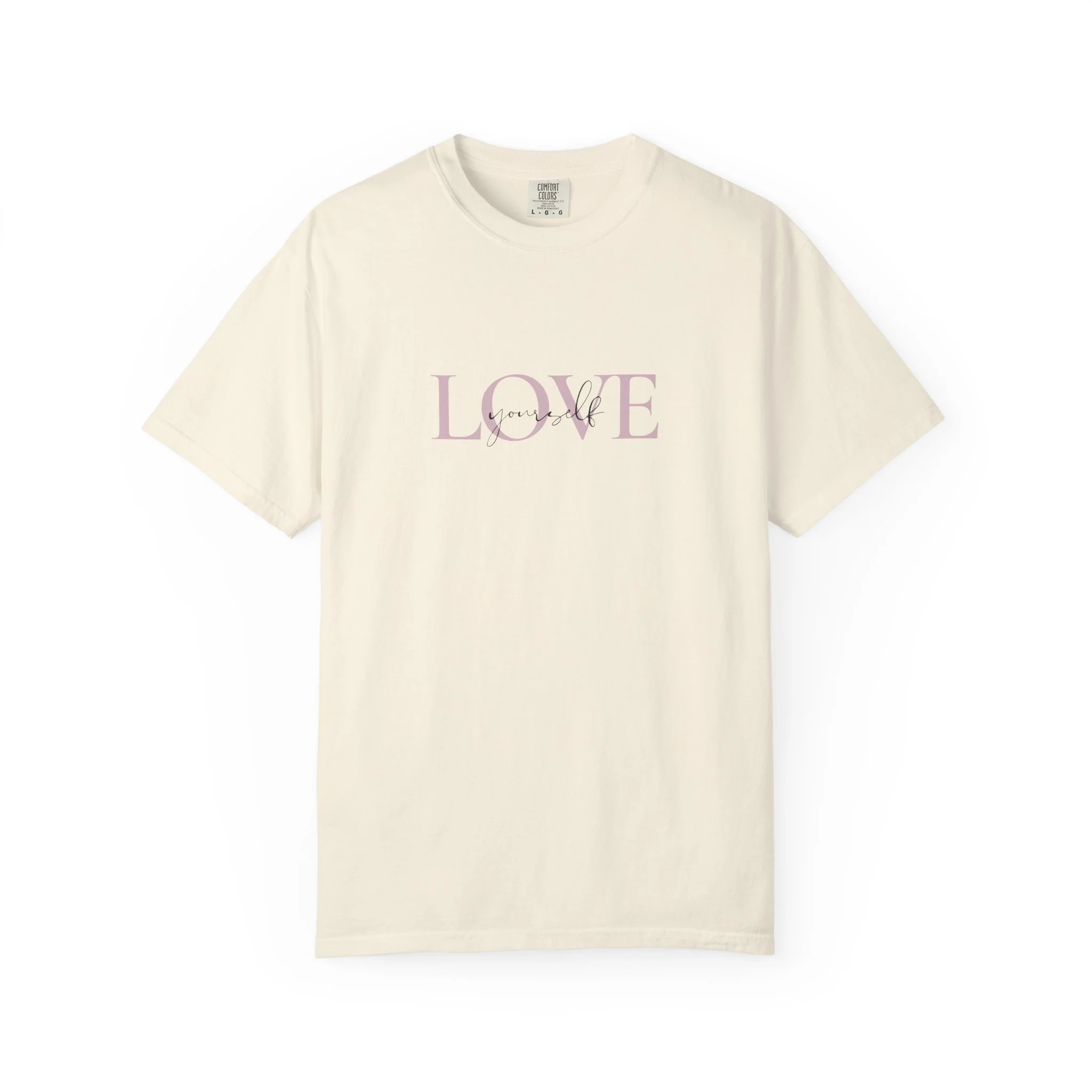 Silky-soft, garment-dyed cotton with a gentle, understated graphic that reads “LOVE Yourself” across the chest. This relaxed tee settles easily into everyday life — worn solo on sunlit mornings or layered under a jacket for quiet evenings. The faded, slightly vintage letterpress look gives the word a lived-in warmth, so it feels less like a slogan and more like a small reminder you carry with you. It drapes comfortably across the shoulders, holds its shape after washing, and ages with a comforting softness that makes it one of those shirts you reach for again and again.